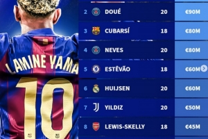 体育资讯8月7日讯 2025年科帕奖10名候选人公布,德转也列出10人身价榜,其中亚马尔2亿欧居首,具体如下: