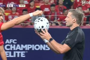 比赛第14分钟,莱切特向主裁反馈皮球破了,需要更换一颗。
