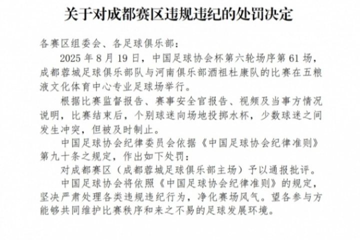 对成都赛区(成都蓉城足球俱乐部主场)予以通报批评。