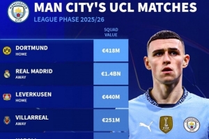 体育资讯8月29日讯 本赛季欧冠联赛阶段对阵抽签结果出炉,德国转会市场盘点了曼城对手的身价。