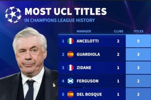 欧冠夺冠次数榜:教练安切洛蒂5冠居首,球员魔笛等5人斩获6冠
