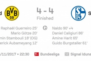 无独有偶,多特曾在2017年11月的德甲第13轮鲁尔德比上演“惊世名局”!再4-0领先的情况下,下半场遭沙尔克04连扳4球,最终同样4-4战平!