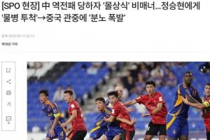 “被水瓶击中的郑升炫愤怒地向中国球迷提出抗议,正在热身的李清龙上前制止避免冲突升级,但这一幕足以展现中国球迷的不文明。”