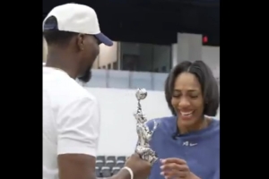 值得一提的是,WNBA总裁凯茜-恩格波特手持奖杯,将其交给了阿德巴约。而阿德巴约也开心地给女友颁发了奖杯,阿贾流下了激动的泪水。
