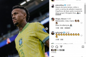 米利唐上次为巴西队出战要追溯到去年7月份,此后他因伤病长期缺席,米利唐更新社媒动态,表达了入选巴西队名单的喜悦之情。