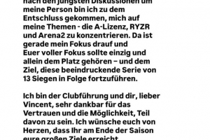 我衷心感谢俱乐部管理层以及您——亲爱的文森特给予的信任与共事机会。我诚挚祝愿你们在本赛季末实现所有宏伟目标。同时,我要向众多送来信息表达支持的朋友们致以真挚谢意。