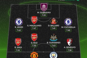 中场:萨卡(阿森纳)、赖斯(阿森纳)、吉马良斯(纽卡斯尔)、塞梅尼奥(伯恩茅斯)