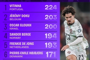 世欧预进攻三区成功传球榜:维蒂尼亚压多库居首,德容、魔笛在列